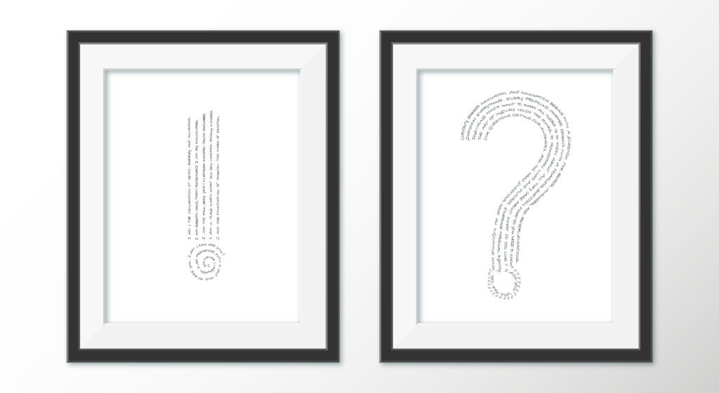 $120.00A playful yet profound Word Art pairing honoring expression and curiosity. THE CONVERSATIONALIST brings together I AM ! and I AM ?—two handwritten reminders designed to live together in thoughtful dialogue.